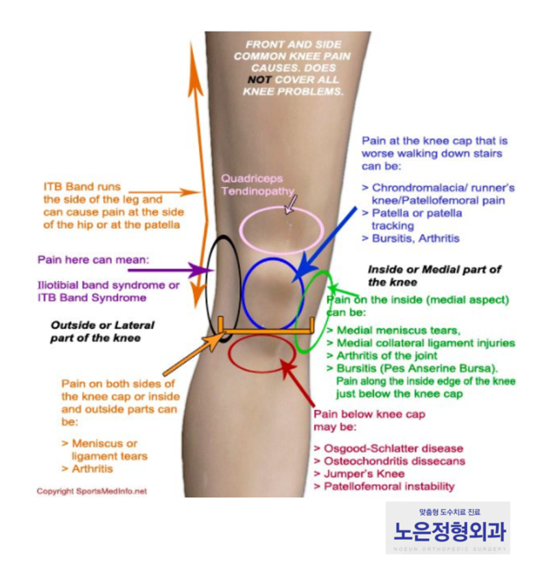 가장 흔한 증상은 무릎 통증으로 초기에는 움직임에 따라 악화되지만 진행성 관절염의 경우 가만히 서 있어도 통증이 지속된다. 또한 낮에 활동할 때보다 밤에 통증이 더 심하며 통증이 수면에 영향을 미치며 걸을 때 통증, 쪼그려 앉을 때 통증, 오래 앉아 있다가 일어설 때 통증, 통증 등을 호소한다. 계단을 오르내릴 때.골관절염 치료
