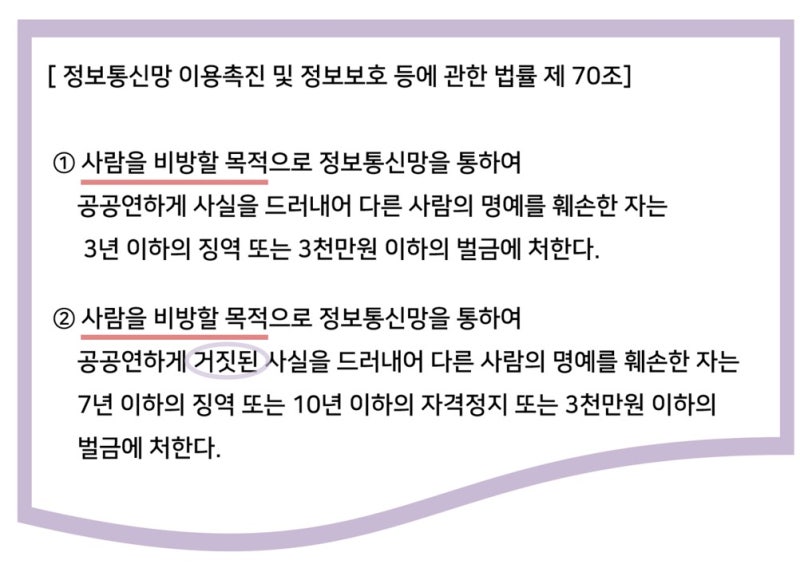 형법 제307조 근거▲공연히 ▲사실을 적시하여 ▲사람의 명예를 훼손한 자는 2년 이하의 징역이나 금고 또는 500만원 이하의 벌금으로 처벌할 수 있습니다. ▲ 허위사실로 명예를 훼손한 경우 5년 이하의 징역, 10년 이하의 자격정지 또는 1천만원 이하의 벌금으로 가중처벌됩니다.전파 파급력이 큰 ‘정보통신망’ 매체를 이용하여 행한 경우, 타인의 명예를 훼손한 경우 정보통신망 이용촉진 및 정보보호 등에 관한 법률에 의해 가중처벌됩니다. 제70조, 제44조의7에 따라 ▲사람을 비방할 목적으로 ▲정보통신망을 통하여 ▲공연히 사실을 드러내고 ▲다른 사람의 명예를 훼손한 자는 3년 이하의 징역 또는 3천만원 이하의 벌금에 처합니다. ▲ 거짓 내용의 경우 7년 이하의 징역, 10년 이하의 자격정지 또는 5천만원 이하의 벌금에 처합니다.