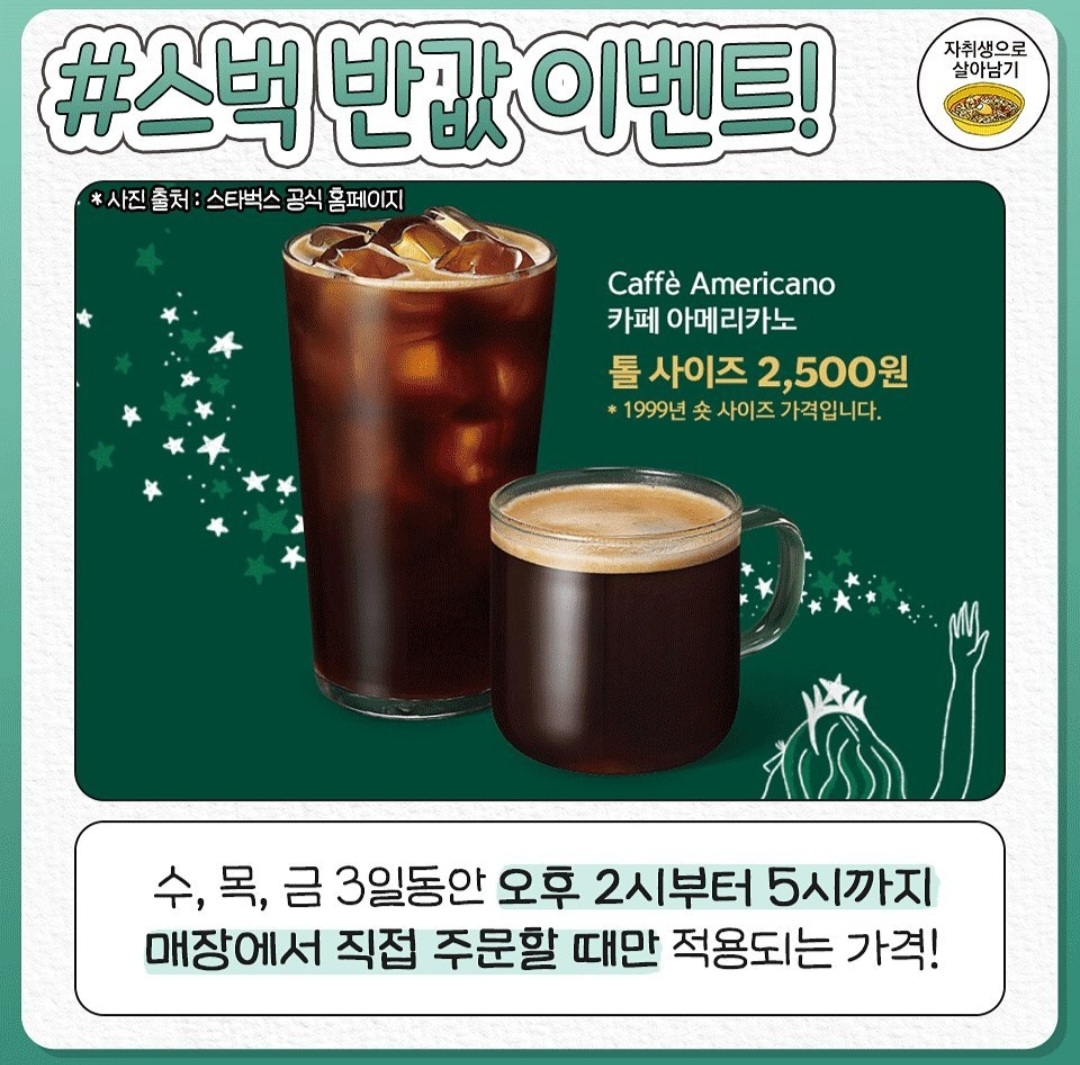 아메리카노, 디카페인 1/2, 블론드 아메리카노, 핫/아이스 전품목 2,500원. 큰 사이즈는 2,500원이라고 합니다. 일부 매장에서는 이벤트가 적용되지 않는 곳도 있다고 합니다. 사용해보고 이 기간과 시간이 맞다면 참여하여 혜택을 누리세요!