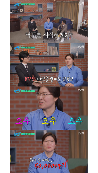 장미란은 “하루에 5만kg 정도 들었다. 어렸을 때 2만~3만kg을 들었다”고 말했다.