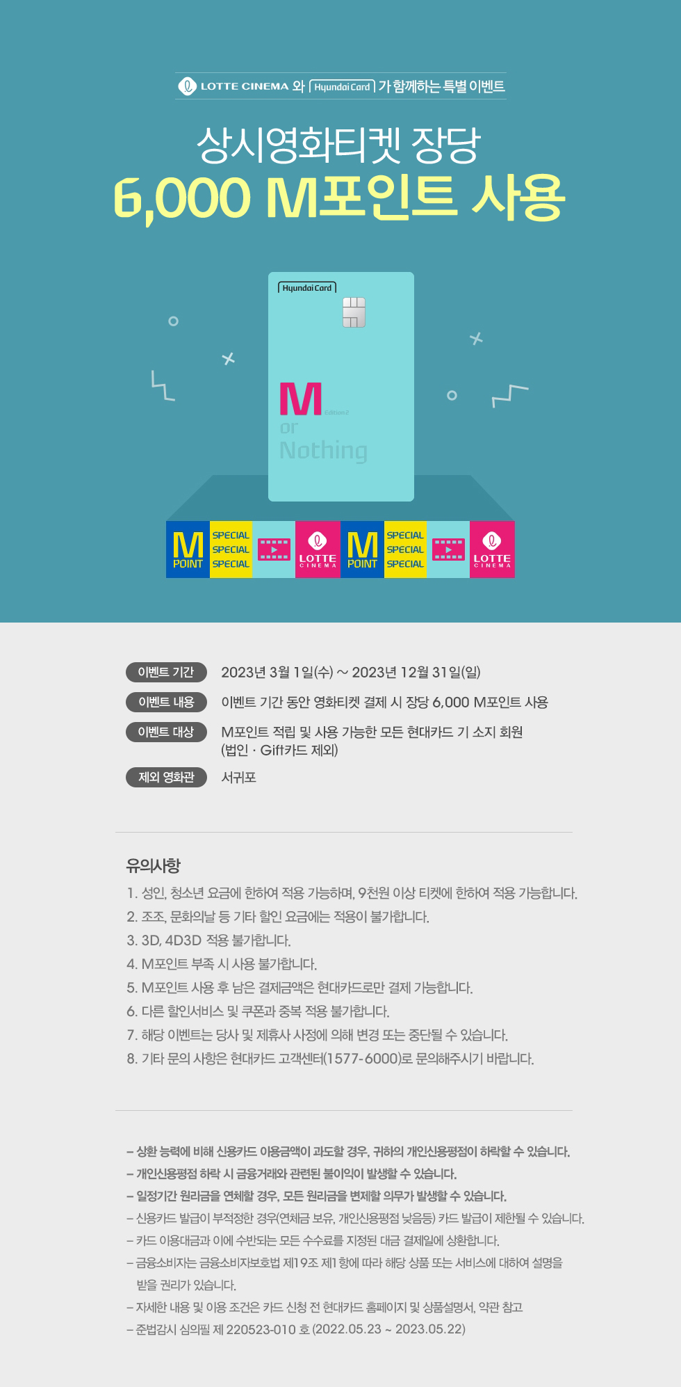 또한 롯데시네마와 마찬가지로 현대M 포인트 차감 및 기타 제휴 신용카드 할인 혜택을 받으실 수 있습니다.